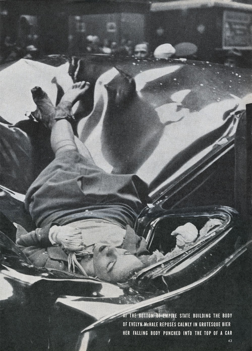 Cayó sobre una limusina de las Naciones Unidas, bella, tranquila, serena, sonriendo. Un fotógrafo la inmortalizó para siempre y fue portada del Life como «El suicidio más hermoso del mundo». Al llegar la policía y mirar en sus efectos personales encontraron una pequeña nota con el membrete del hotel Governor Clinton: